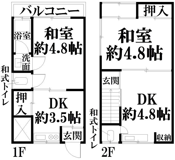 | 間取り | 1DK×2戸 (DK 3.5帖 DK 約4.8帖 和室 約4.8帖 和室 約4.8帖 ) | ||