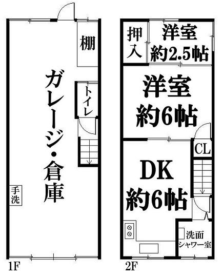 | 間取り | 2DK ガレージ・倉庫 (DK 6帖 洋室 約6帖 洋室 約2.5帖 ) | ||