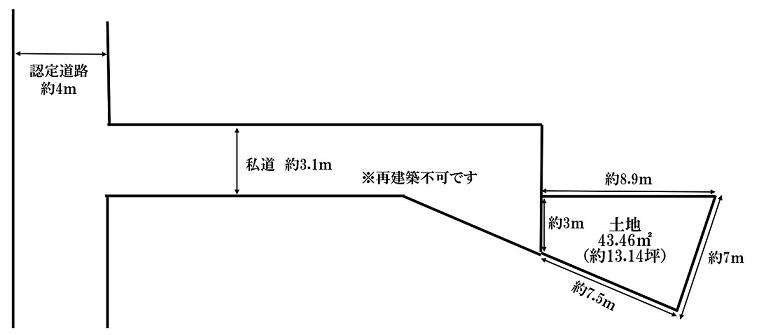 | 備考 | ※現状有姿 ※公簿取引 ※契約不適合責任免責 ※再建築不可 ※私道負担30.32uのうち、売買対象は持分5分の1です。 |