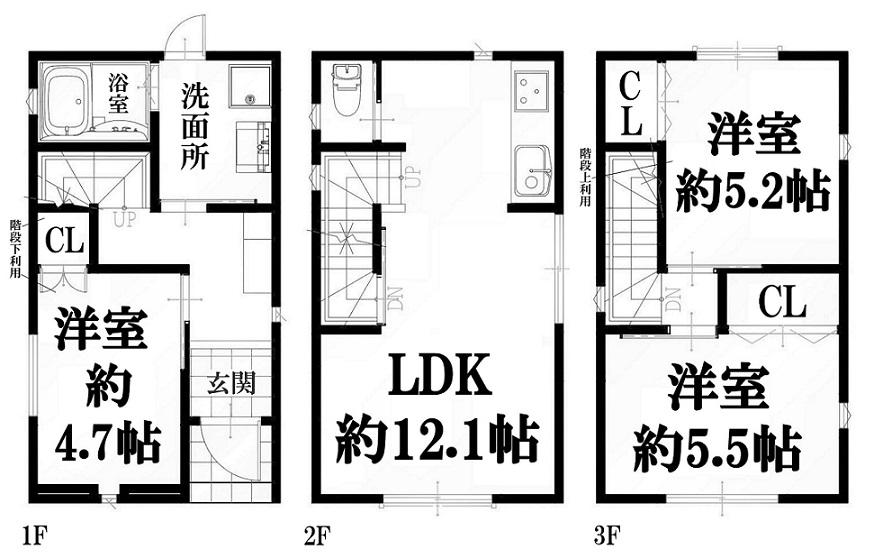 | 間取り | 3LDK (LDK 12.1帖 洋室 約5.5帖 洋室 約5.2帖 洋室 約4.7帖 ) | ||