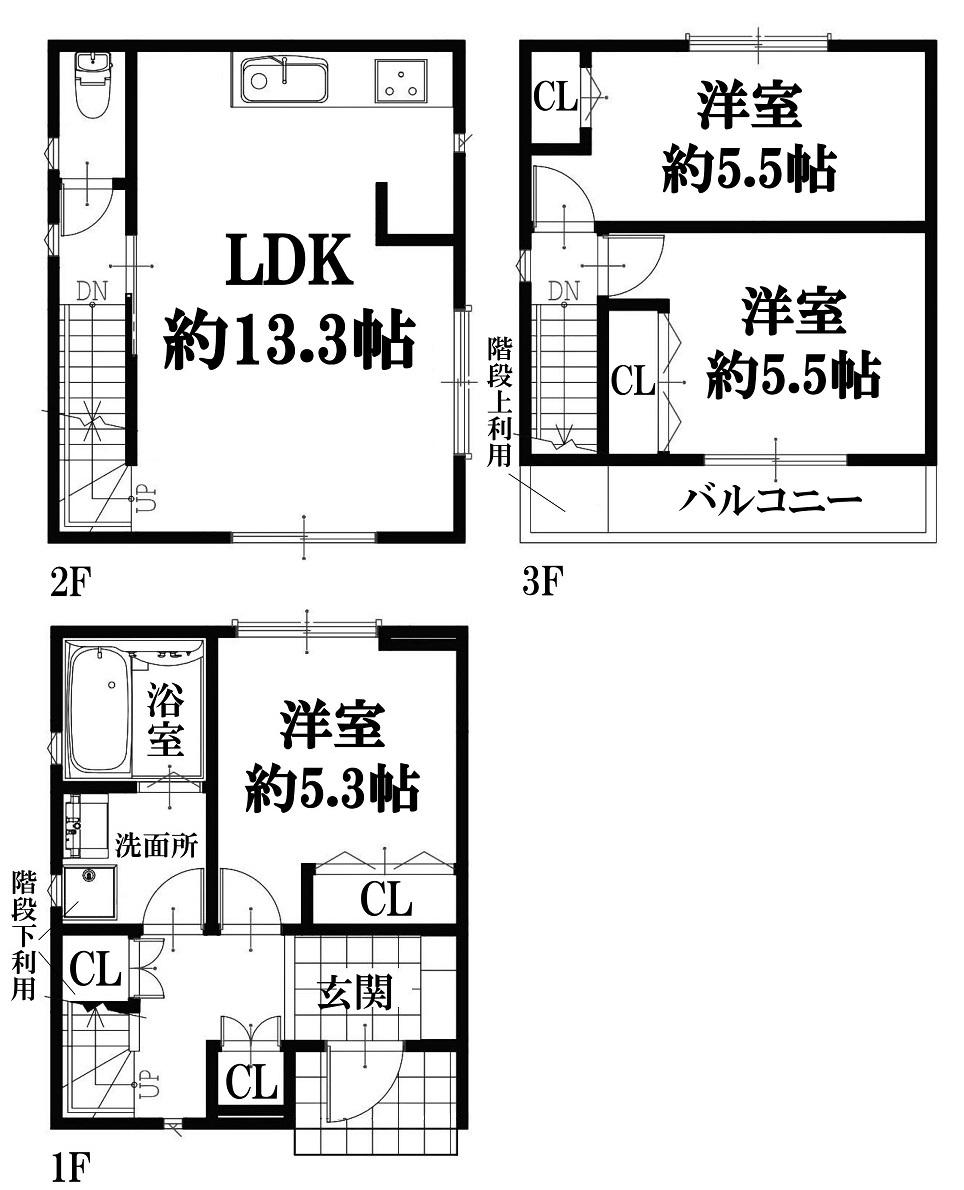 | 間取り | 3LDK (LDK 13.3帖 洋室 約5.5帖 洋室 約5.5帖 洋室 約5.3帖 ) | ||